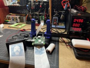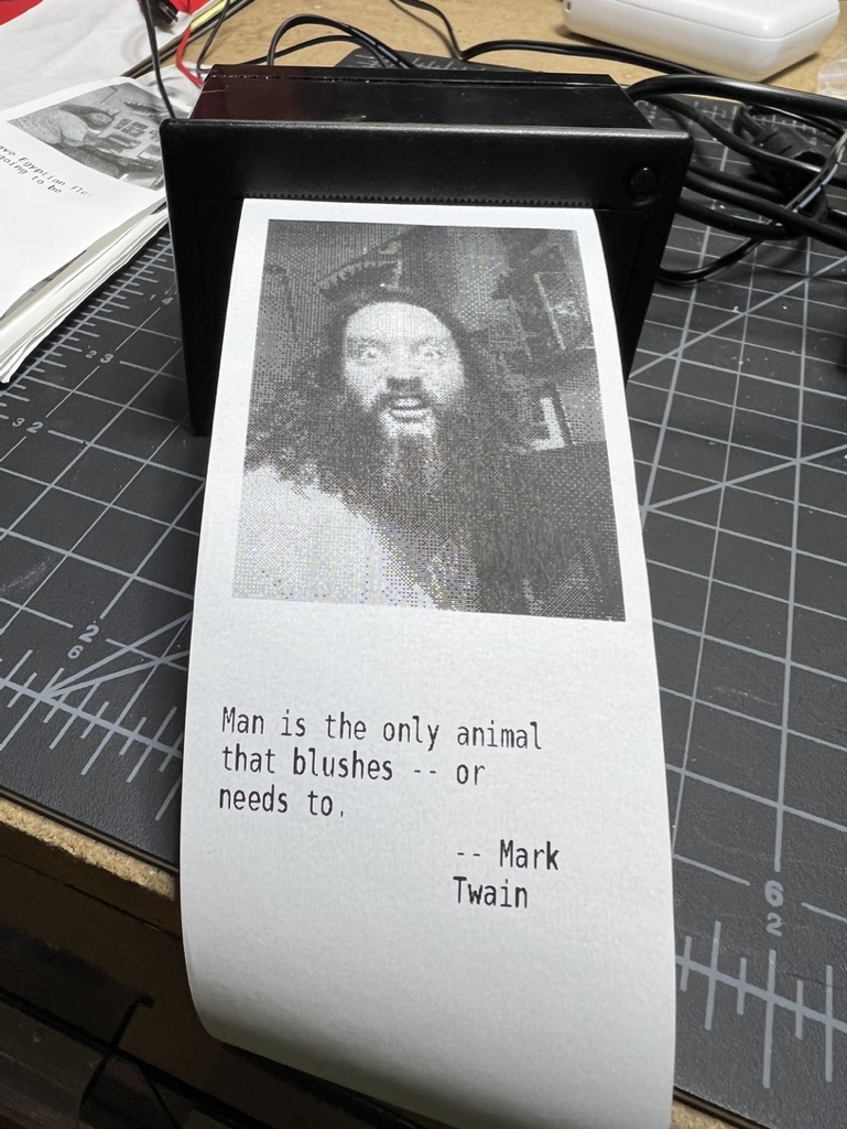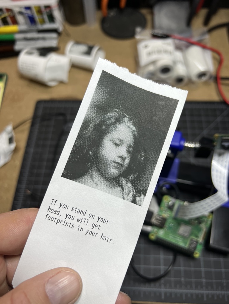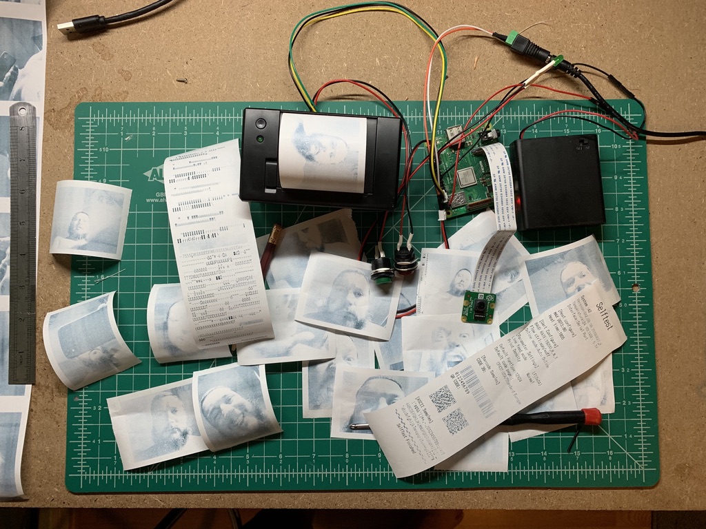 This printer uses a camera and takes a picture then prints it out along with a random quote from the internet using a thermal receipt printer. We built this using a Raspberry Pi 3 (https://www.raspberrypi.org/). It is programmed in Python (https://www.python.org/) and uses batch files to send data to the printer driver. This was a fun project and took my Dad and I a long time to get working. We still need to design and print a case for the electronics.
