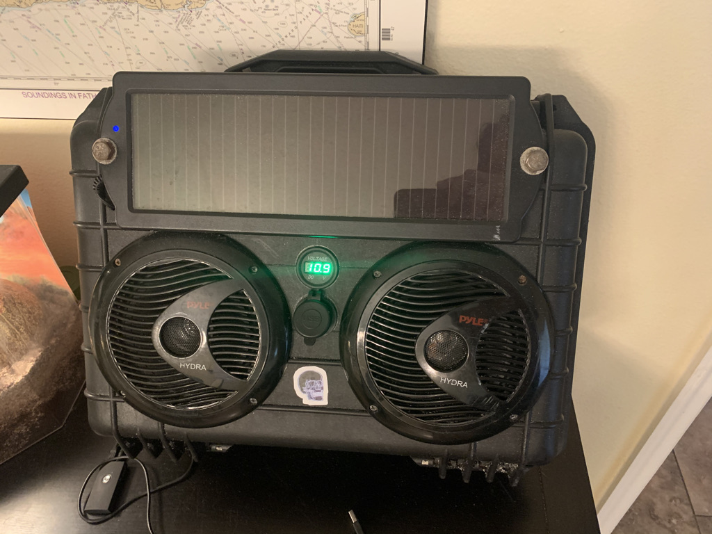 The Jam Box is something we use all the time.  We built it to be a long playing battery powered Bluetooth stereo speaker.  It has a solar panel to charge the batteries when being used.  It can play for about 30hrs before having to be charged.  Also it is waterproofed and uses marine speakers.