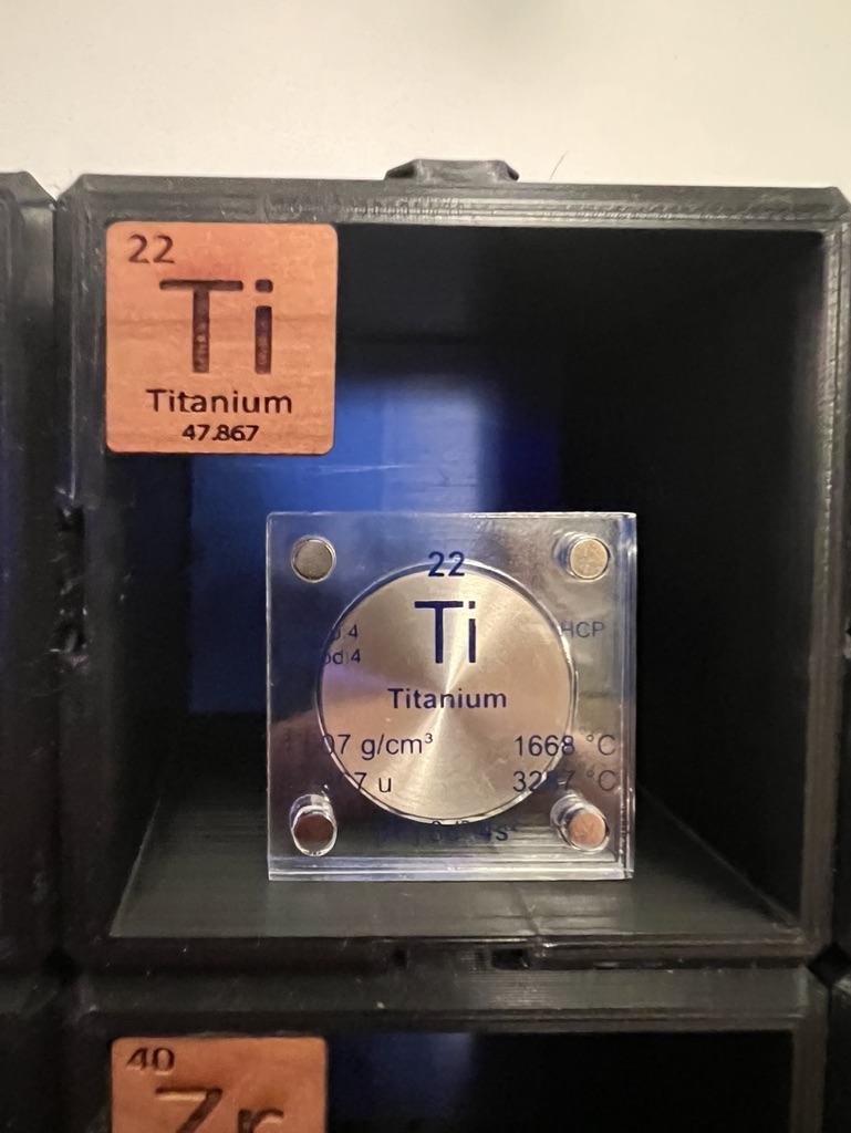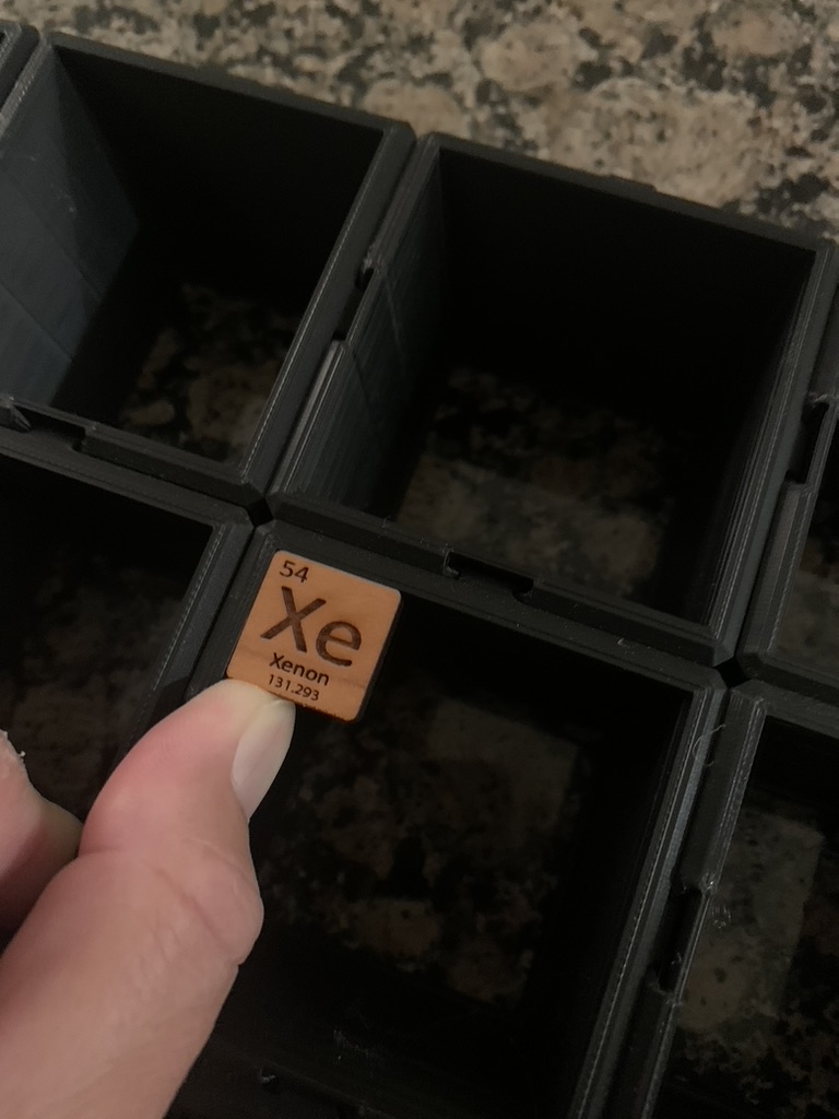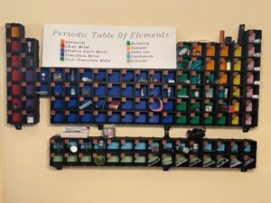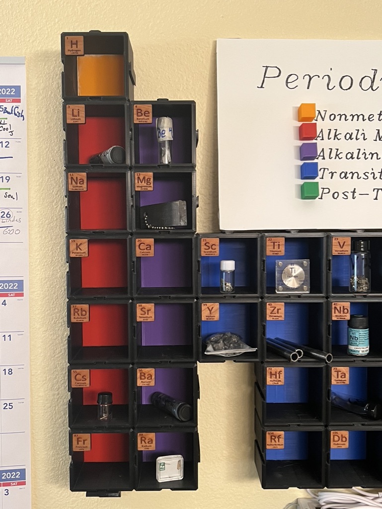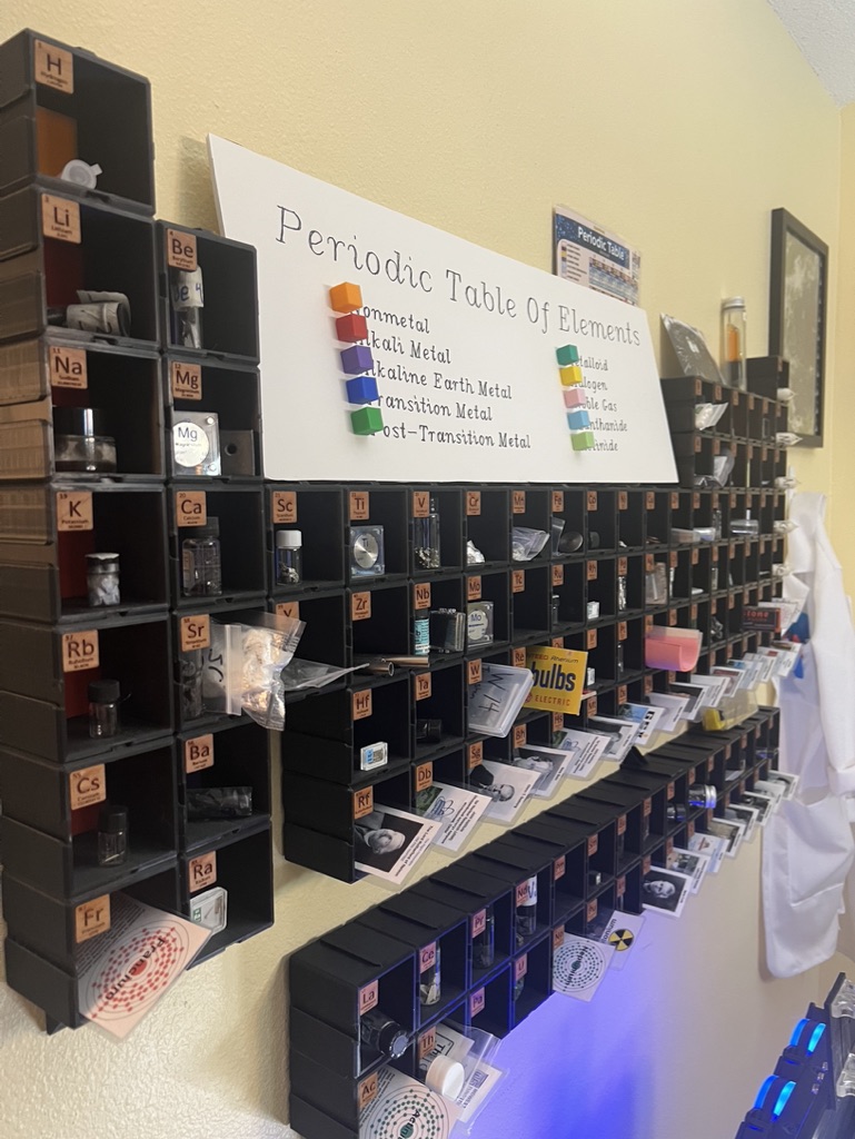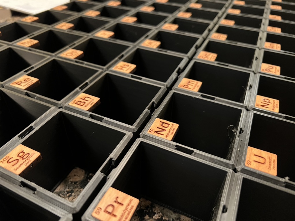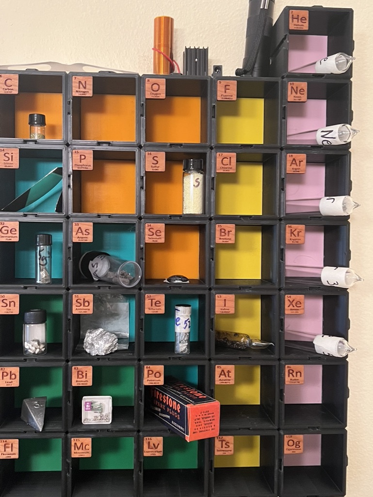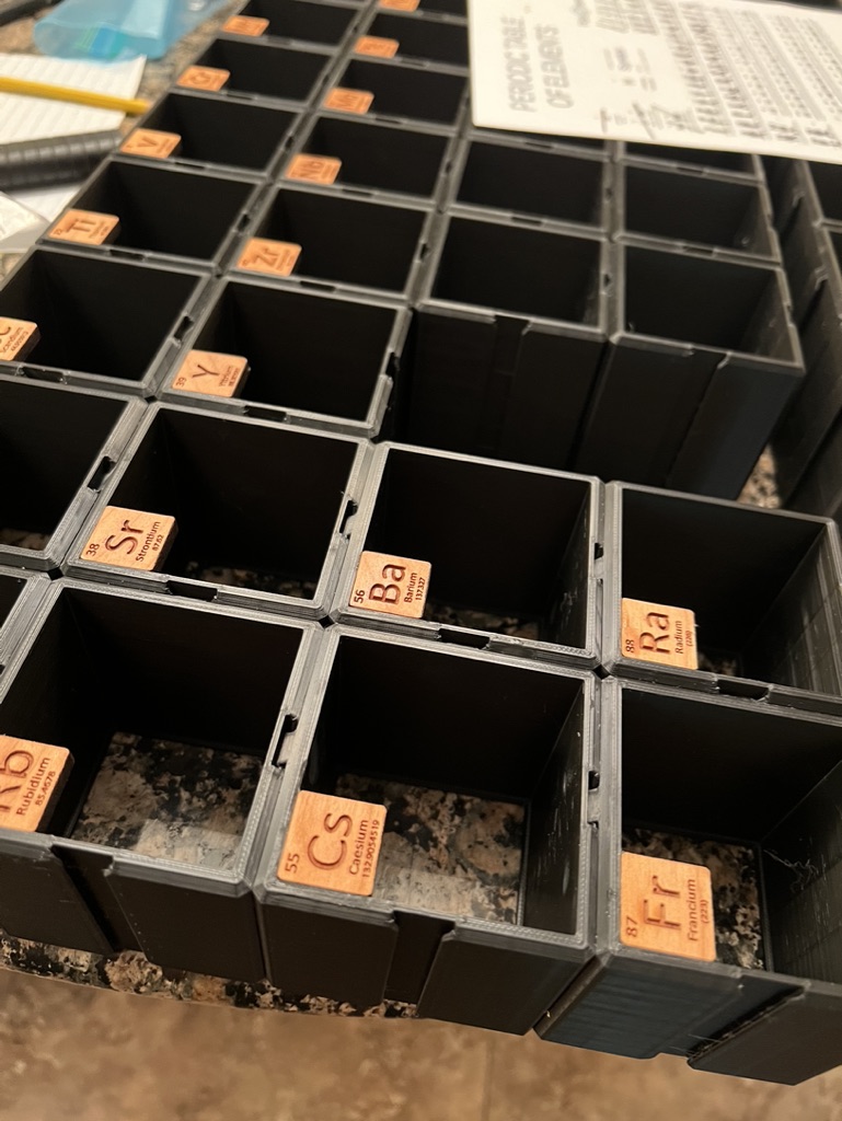 This is our periodic table of elements. There are samples for elements and also real world examples of how the elements are used. We 3d printed the whole thing and used laser cut wood blocks for the labels.  Below are some images and a list of elements we have.