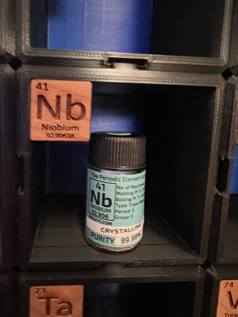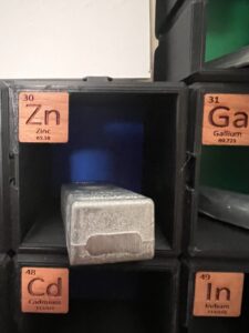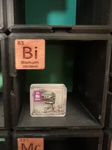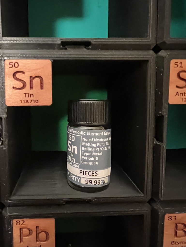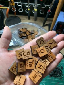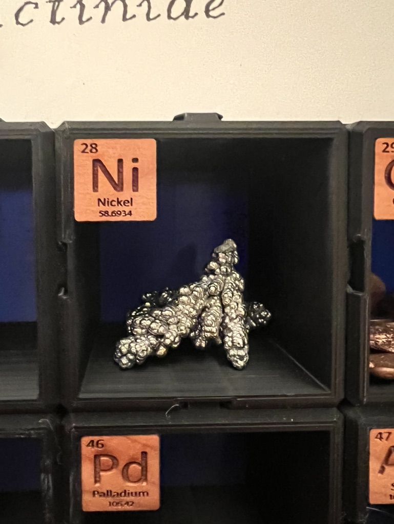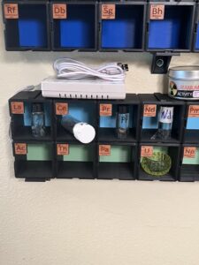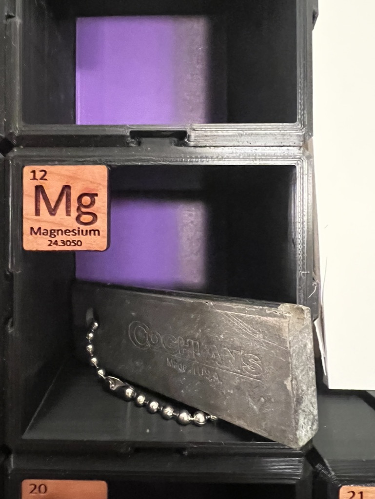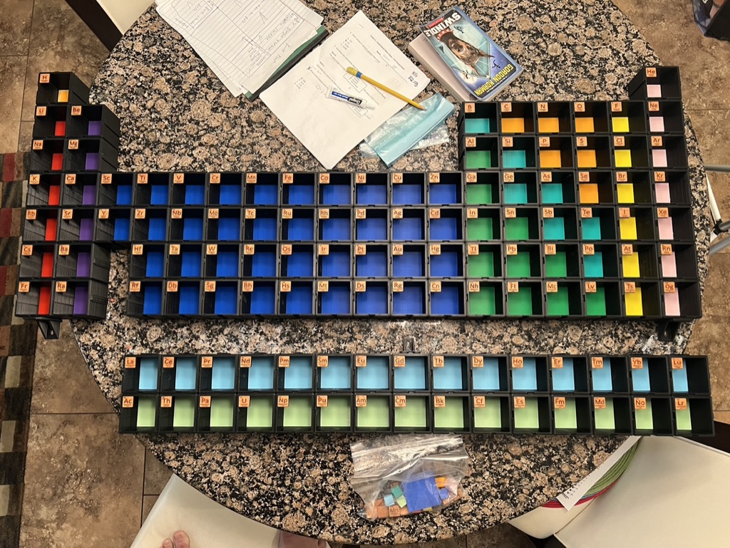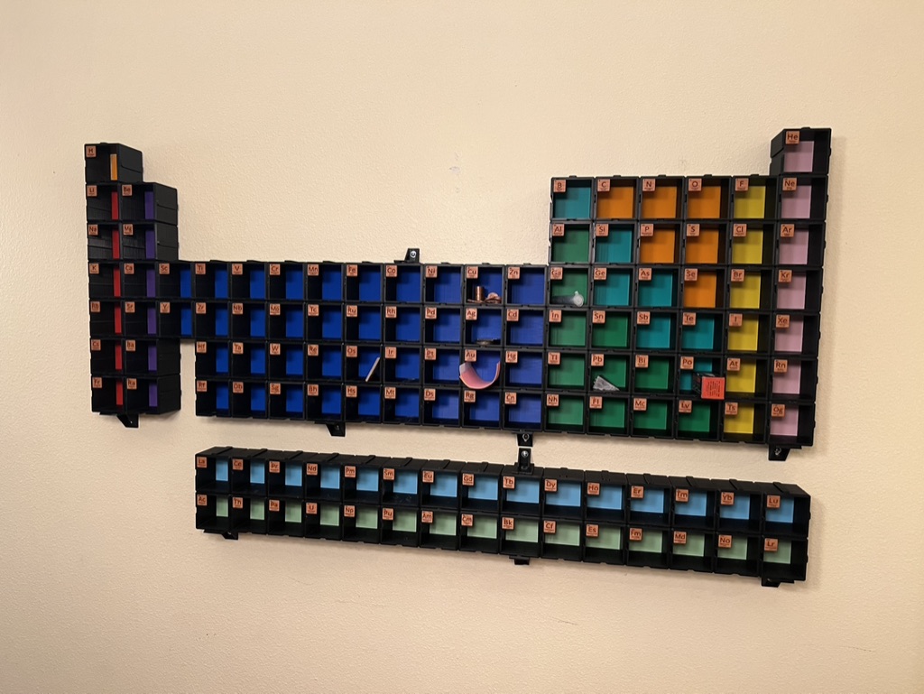 This is our periodic table of elements. There are samples for elements and also real world examples of how the elements are used. We 3d printed the whole thing and used laser cut wood blocks for the labels.  Below are some images and a list of elements we have.