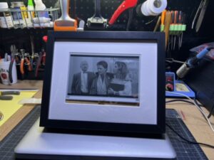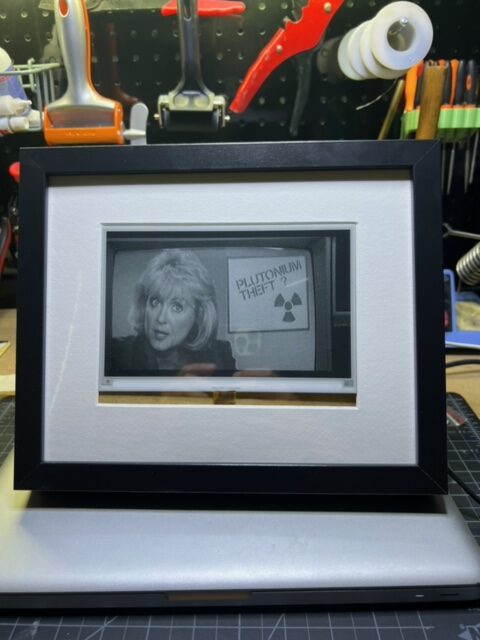 Really Slow Movie Player Posted on November 27, 2023February 18, 2024 This is our really slow movie player! It uses an e-paper display and plays a movie at 4 frames every 2 min. Every time you look at it, it is a different picture from the movie. I change out the movies for the time of year, like holidays and stuff.