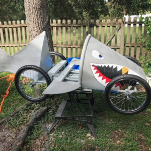 The SKARK CART!!! I helped my Dad weld and build a soap box derby cart for a race. We won 1st place for best team theme. We used fiberglass to make the shell on top of the metal frame.